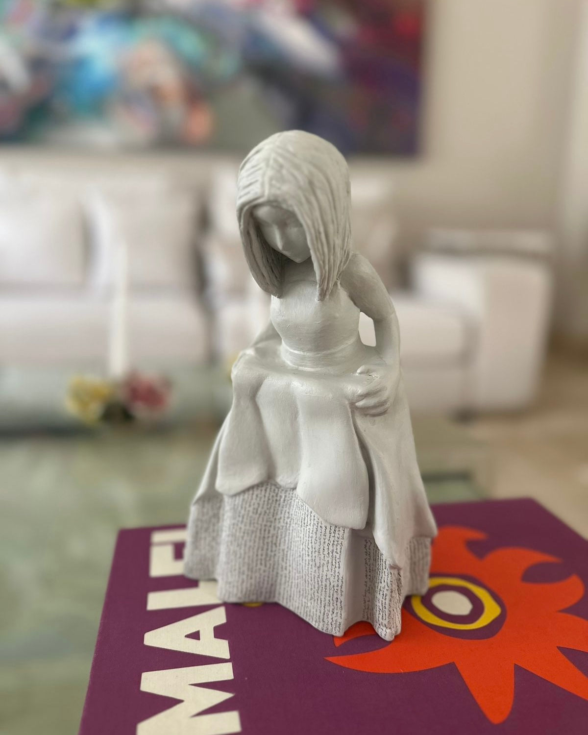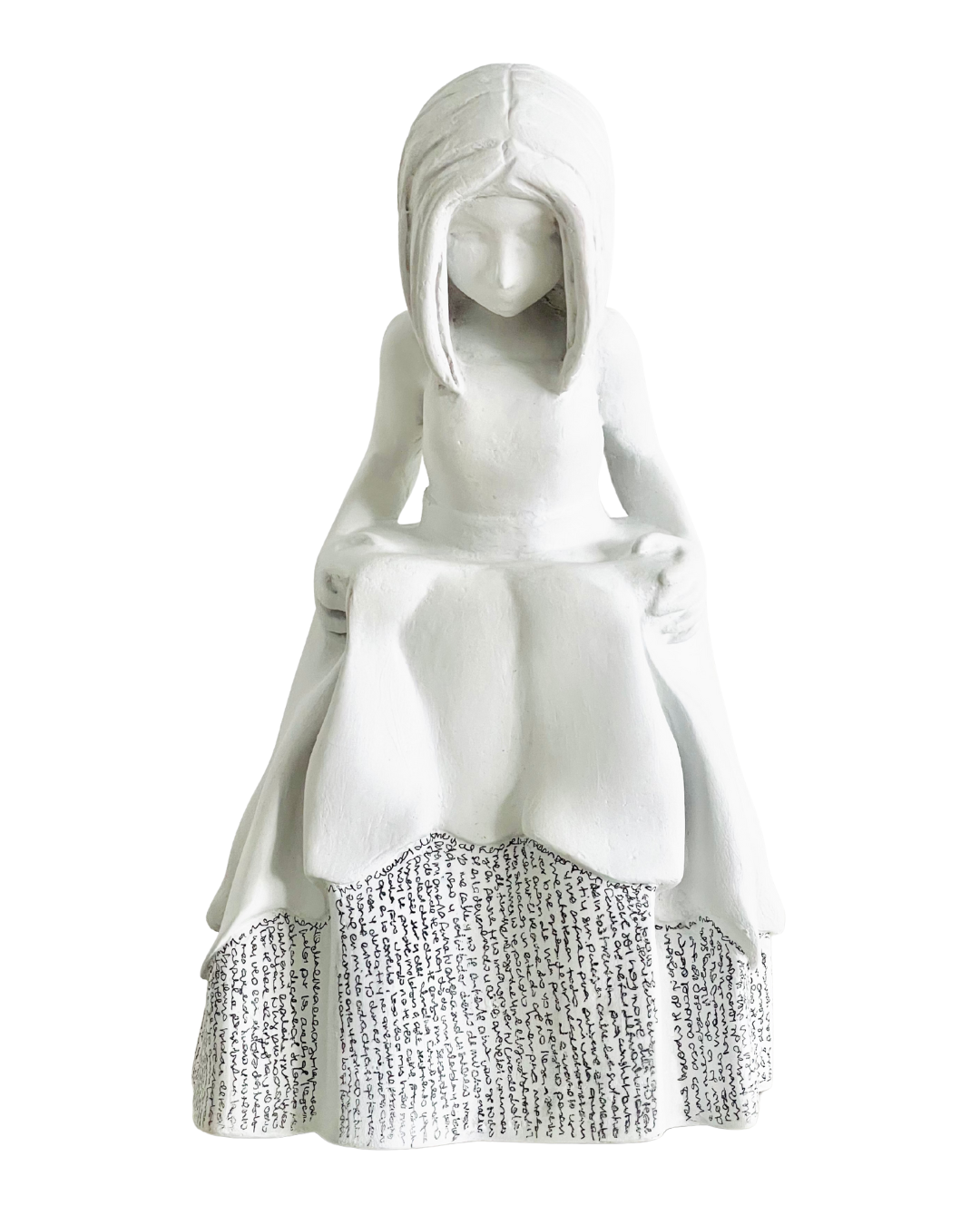 Sanando Azula es una escultura que simboliza el proceso de sanación y transformación interior. Con la escritura fluida de poemas y una presencia etérea, transmite serenidad y resiliencia. Su color y textura evocan la conexión con lo divino y la profundidad emocional, invitando a la introspección y al equilibrio.