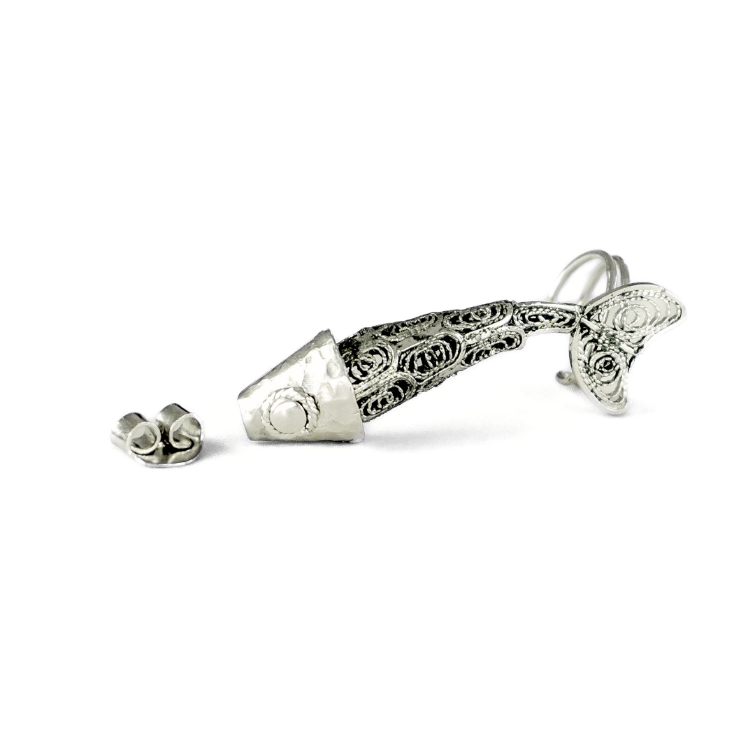 Earcuff Solitario solitario de 4 cm de largo.El Bocachico es un pez de agua dulce, común en ríos especialmente en el Río Magdalena. Nuestras esculturas de Bocachico, elaboradas a mano con hilos de plata ley 925 en oro blanco.