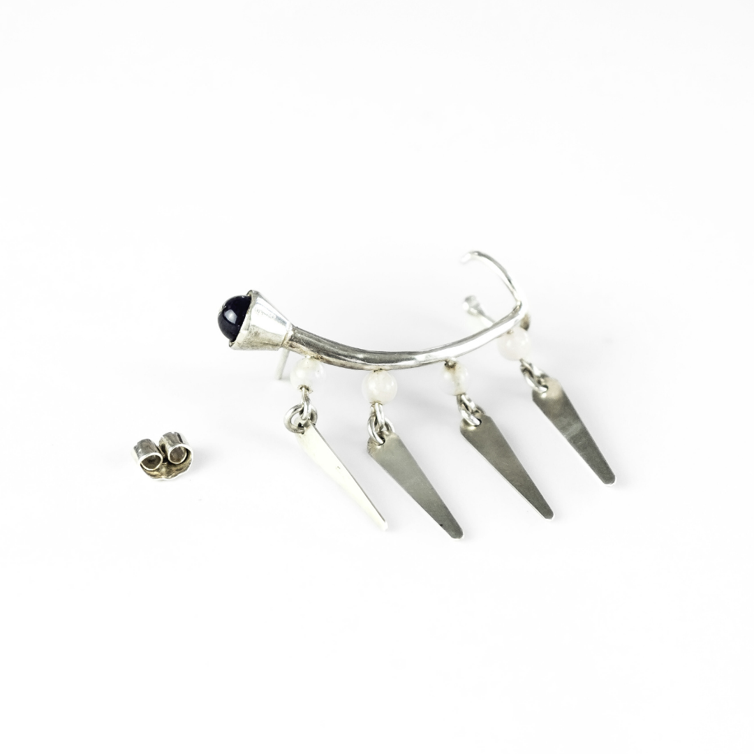 Earcuff Lanza, es un solitario inspirado en las lanzas utilizadas en la Edad Media para la pesca en ríos. Este diseño está elaborado a mano con hilos de plata de 1,000 con baño en rodio en oro blanco o enchape en oro 24 quilates. La pieza viene con ágatas naturales identificadas como amatista y cuarzo rosado que van engastadas en pieza.